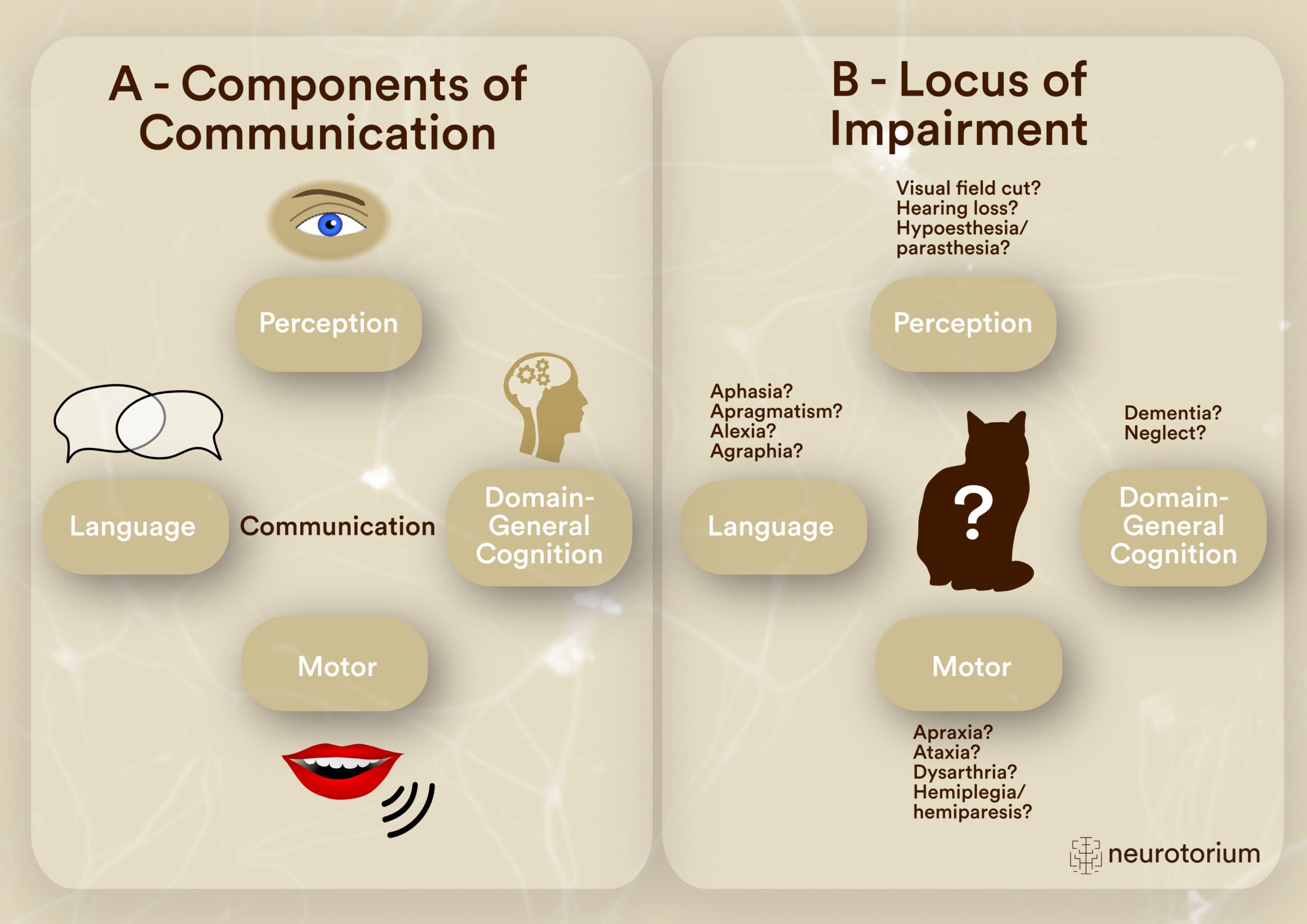 Figure 1: Components needed for a successful communication exchange (A) and possible consequences of disrupted component functioning due to stroke (B)