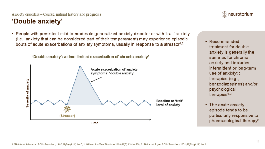 The need for treatment of an anxiety disorder is determined by the severity and duration of anxiety symptoms, the degree of associated distress, the level of impact on everyday life, and the coexistence of depressive symptoms. The following articles highlight emerging topics of interest within research and clinical practice.