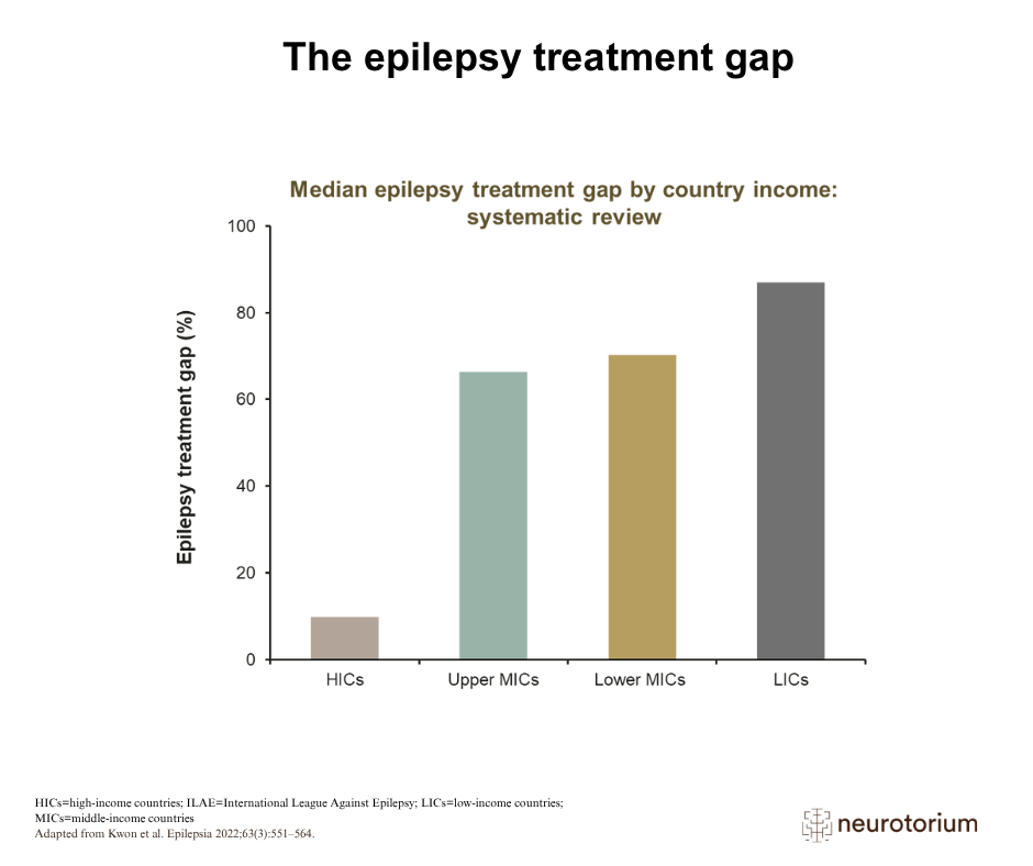 The ILAE Commission on the Developing World has defined the epilepsy treatment gap as the difference between the number of people with epilepsy and those with epilepsy who receive antiseizure medication.1 This figure summarizes findings from a systematic review of 45 epidemiological studies, in which treatment gaps were calculated as the proportion of people with epilepsy who were either not receiving antiseizure medication or receiving inadequate treatment. The estimated epilepsy treatment gap ranged from 9.8% in high-income countries to 86.9% in low-income countries.1