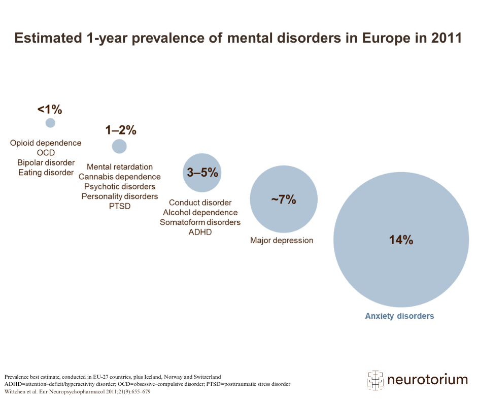 Anxiety disorders have the highest 1-year prevalence among all mental disorders (14%), affecting almost 70 million people in Europe across all age groups; the most prevalent anxiety disorders include specific phobias (6.4%), social anxiety disorder (2.3%) and agoraphobia (2.0%).1 The prevalence rates of individual disorders differ by age groups: for example, prevalence rates for generalized anxiety disorder are much higher among people aged over 65 years (3.4%) than in people aged 65 years and under (1.7%), and PTSD rates decline with age (14–34 years: 2.9%, 35–65 years: 1.3%, 65+: 1.1%).1