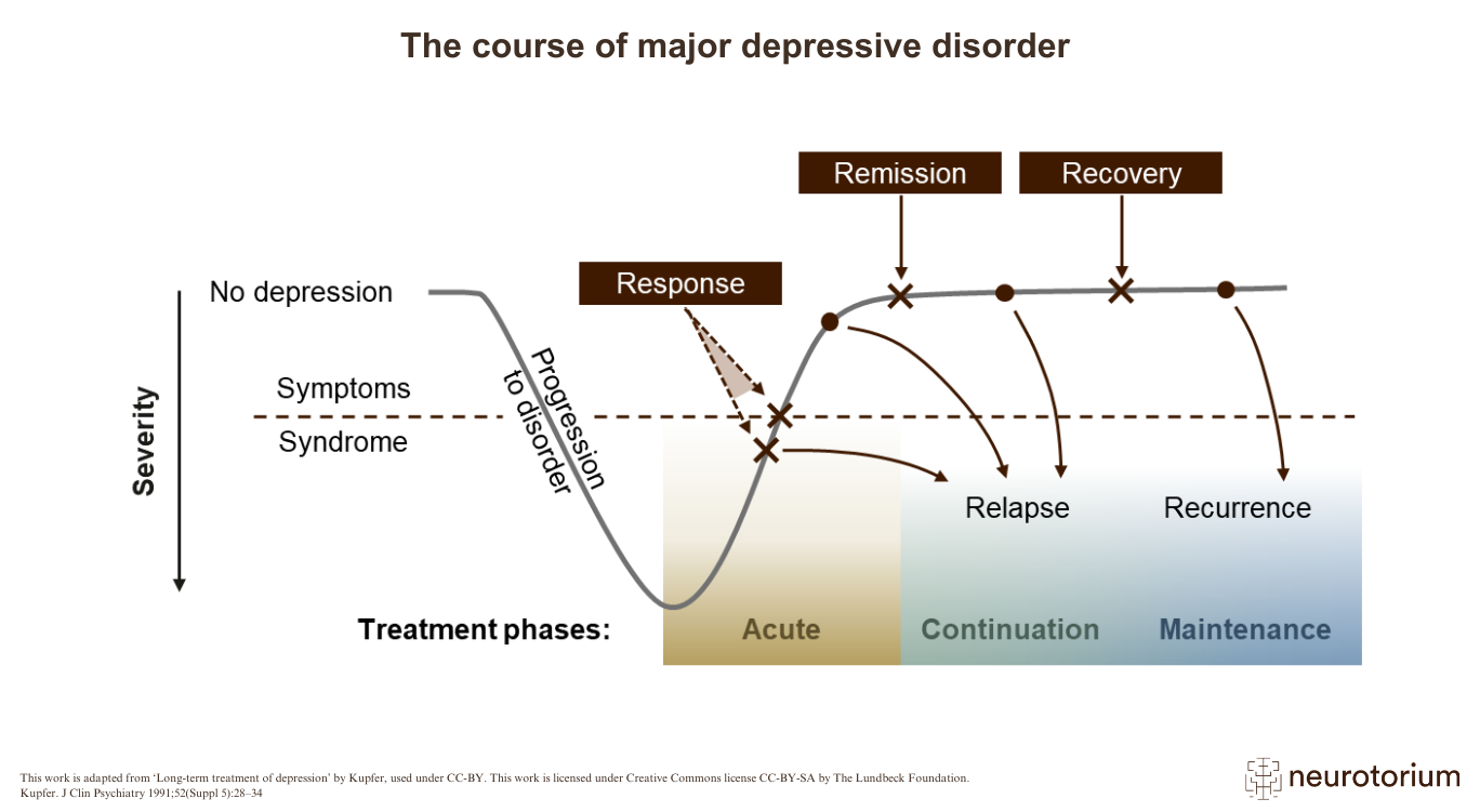 Note: There is a lack of empirical evidence to differentiate between relapse and recurrence, hence, the continuation and maintenance phases are often combined into a single maintenance phase4