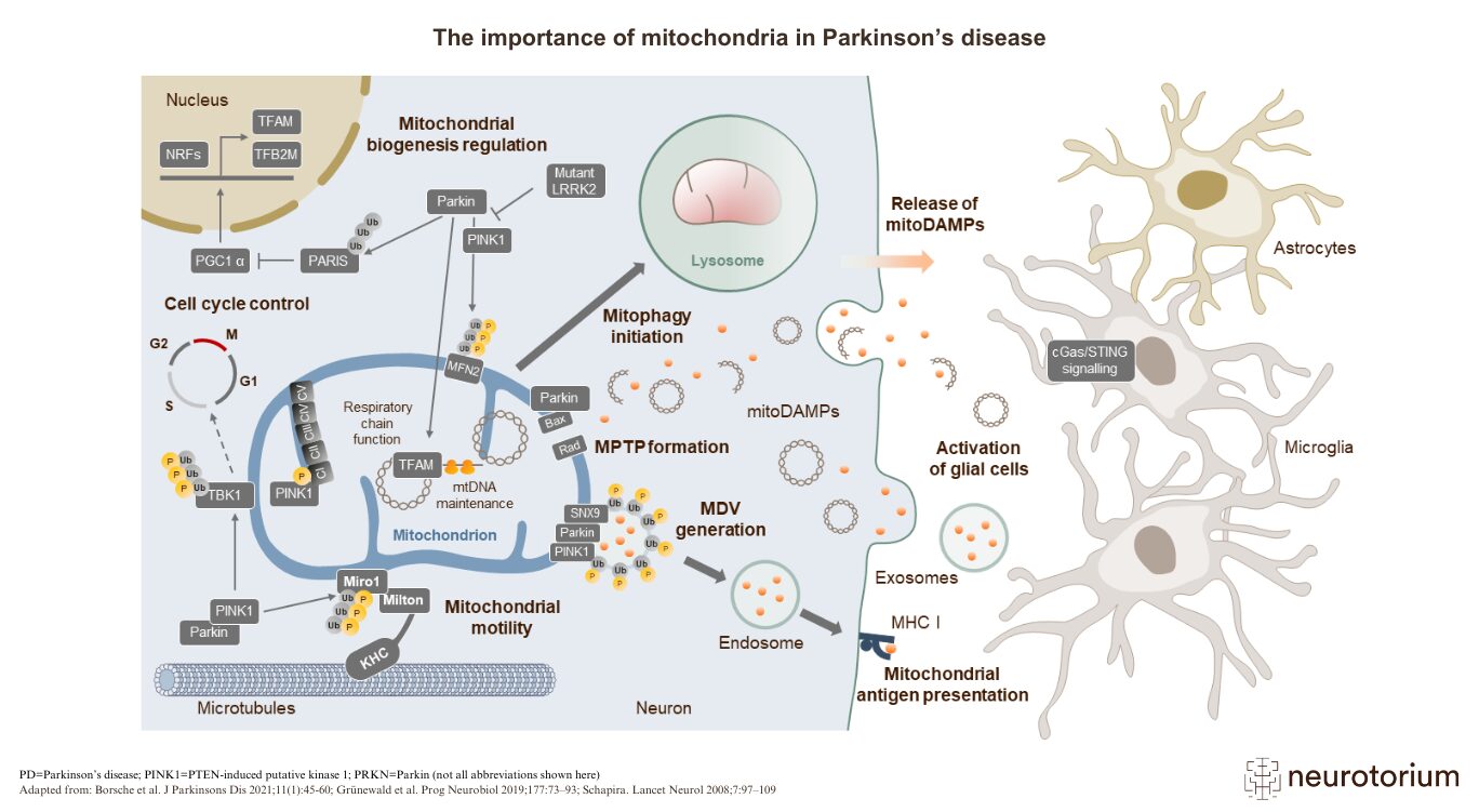 A toxic by-product of normal mitochondrial function is the generation of free radicals, which cause oxidative stress.4 The cellular responses to this oxidative stress are regulated by the genes DJ-1, PINK1, PRKN, and UCH-L1, all of which have genetic variations associated with PD.1-3 Taken together, the evidence strongly suggests that mitochondrial dysfunction plays an important role in the pathogenesis of PD.1,2 This opens the potential for novel treatments that may correct this dysfunction in people with PD.1
