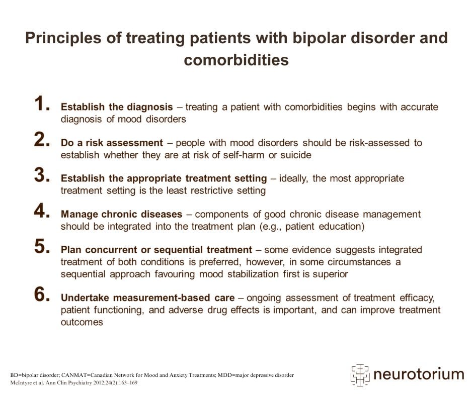 Patients with bipolar disorder and comorbidities are typically more complex cases, involving poorer recovery and a less favourable disease course, than patients with bipolar disorder without medical or psychiatric comorbidities.1 The Canadian Network for Mood and Anxiety Treatments (CANMAT) guidance summarized on the slide was an attempt to produce a clear evidence- and consensus-based guide to helping patients with these comorbidities.1The CANMAT guidance for managing medical and psychiatric comorbidity in individuals with MDD or BD stress the importance of screening patients for comorbid conditions.