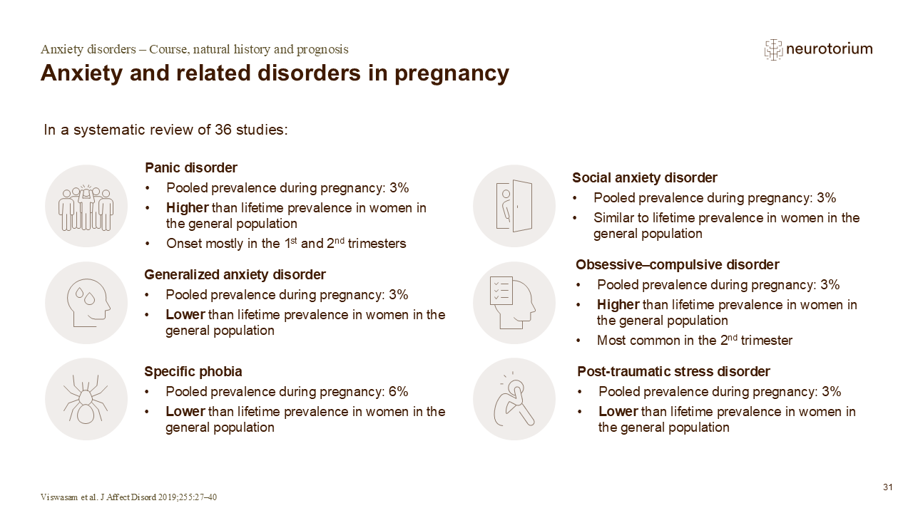 Slide DecksAnxiety disorders – Course, natural history, and prognosisAnxiety and related disorders in pregnancy Anxiety and related disorders in pregnancy Anxiety Disorders south Reference: 1. Viswasam K, Eslick GD, Starcevic V. Prevalence, onset and course of anxiety disorders during pregnancy: A systematic review and meta-analysis. J Affect Disord 2019; 255: 27–40. file_download Download slide in HQ Published 18.08.2025 Permissions For usage star_border Save share Share