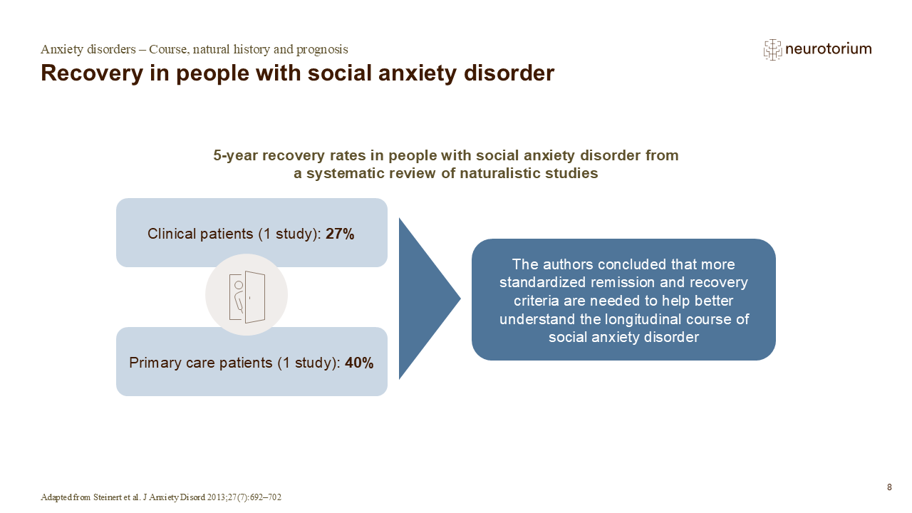 Social anxiety disorder can be a chronic disorder, associated with serious impairments in different areas of life and with lower rates of recovery than other anxiety disorders.1 Standardized remission and recovery criteria, accounting for residual symptoms, comorbid disorders or treatment refractoriness, could facilitate early recognition, interventions, and effective treatment, resulting in reduced impairment and better overall outcomes for patients.1