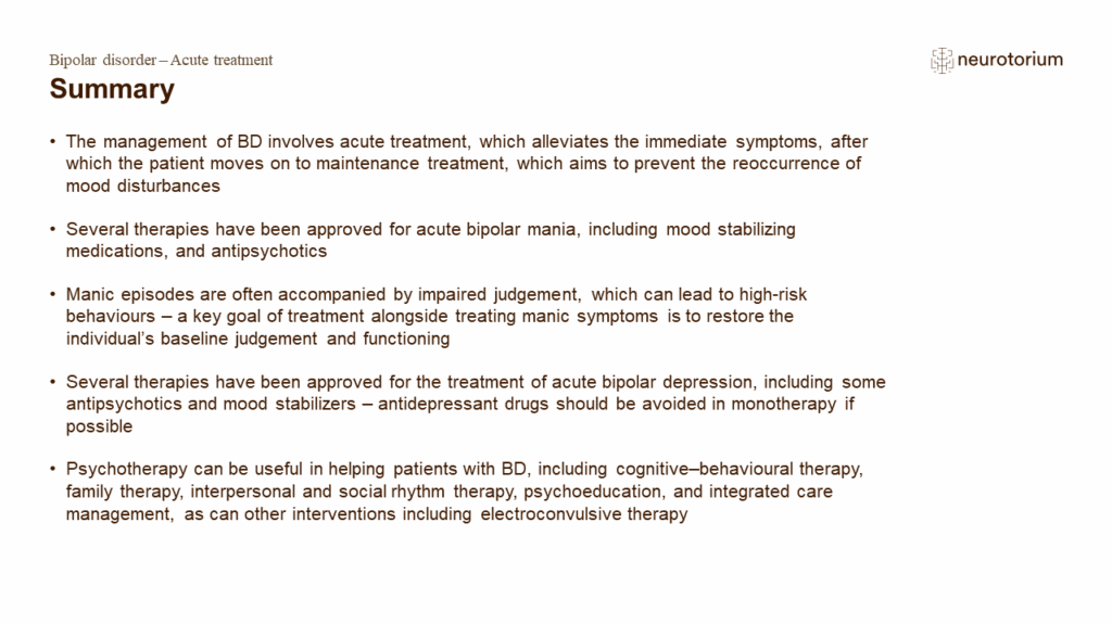 As outlined on the slide, there is some conflicting evidence regarding the use of antipsychotics in the acute treatment of bipolar depression.1,2 However, their use in patients with bipolar mania is broadly supported, and antipsychotics are included in many treatment guid…