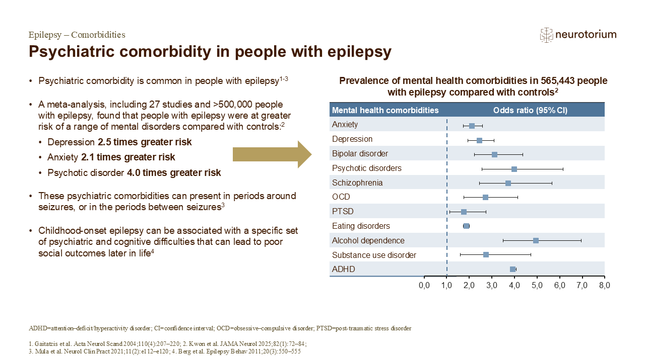 Given the significant impact of psychiatric comorbidities on patients’ overall morbidity burden and their general quality of life, appropriate identification and treatment of any psychiatric comorbidities in people with epilepsy is crucial for effective treatment.2 Moreover, in the meta-analysis by Kwon et al. summarized on the slide, the authors were careful to emphasize that many patients with epilepsy will have multiple comorbid psychiatric disorders, potentially putting them at risk for additional, more severe psychiatric complications, or other adverse outcomes (e.g., cognitive problems, suicidality).2,3 As such, routine screening for psychiatric comorbidities with reliable and validated tools is recommended by multiple epilepsy treatment guidelines,2 and people with epilepsy and any psychiatric comorbidity should receive a comprehensive individualized treatment plan, developed in cooperation with a multidisciplinary team of neurologists, psychiatrists, clinical psychologists and social workers to ensure the best treatment outcomes.3