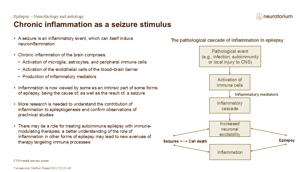 Slide DecksEpilepsy – Neurobiology and aetiologyChronic inflammation as a seizure stimulus Chronic inflammation as a seizure stimulus Epilepsy south Reference: 1.Vezzani A, French J, Bartfai T, Baram TZ. The role of inflammation in epilepsy. Nat Rev Neurol 2011; 7 (1): 31–40. file_download Download slide in HQ Published 26.11.2025 Permissions For usage star_border Save share Share