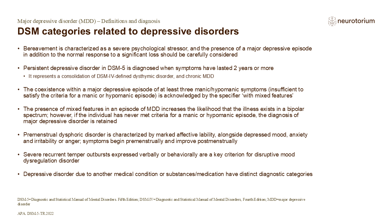 Slide DecksMajor depressive disorder (MDD) – Definitions and DiagnosisDSM categories related to depressive disorders DSM categories related to depressive disorders Depression south Reference: 1. American Psychiatric Association. Diagnostic and Statistical Manual of Mental Disorders. Fifth Edition – text revision. © American Psychiatric Association, 2022. file_download Download slide in HQ Published 01.07.2025 Permissions For usage star_border Save share Share