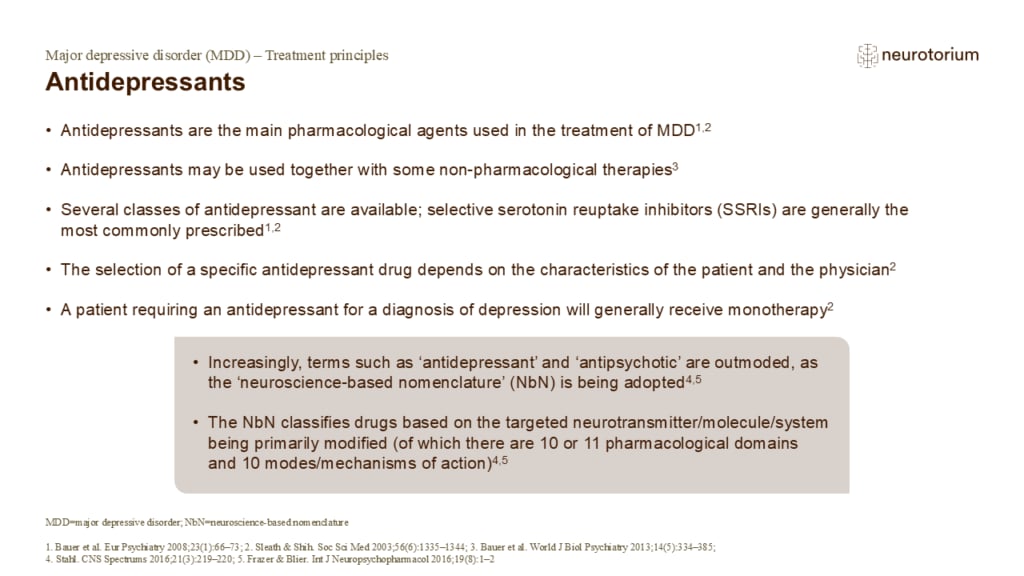 There is no universal treatment guideline for MDD – various evidence-based treatment guidelines have been developed to aid clinicians.1 As shown on the slide, guidelines that have been developed are usually stratified according to the severity of depression – mild, modera…
