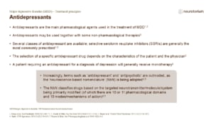 The slide summarizes the global approach to the treatment of MDD, and indicates deviations from this global approach where relevant.