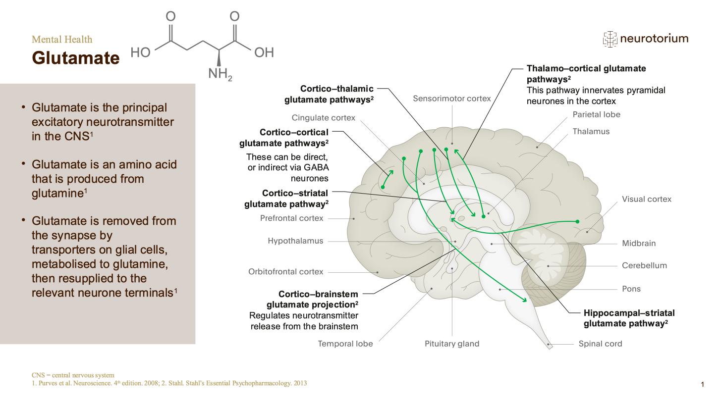 Glutamate is arguably the most important neurochemical for normal brain function.[1] Nearly all excitatory neurones in the CNS are glutamatergic – more than half of the neurones in the brain.[1] It is noteworthy, though, that high concentrations of glutamate are neurotoxic.[1] There are three types of receptor to which glutamate can bind (named after the agonists that activate them), each of which has slightly different properties:[1]