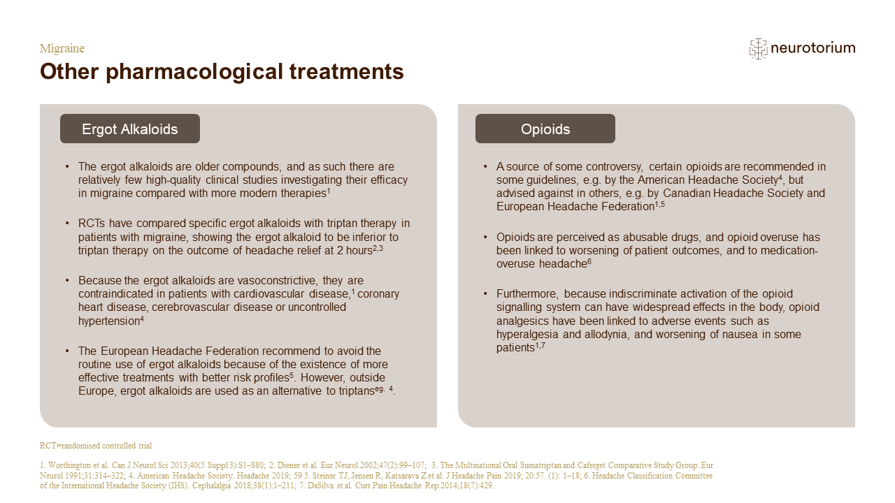 However, many advise to use newer treatments with higher efficacies and better risk profiles [Steiner et al., 2019]. The use of opioids for the treatment of migraine is also not agreed on between different treatment guidelines.[Vargas, 2018] The American Headache Society (AHS) ranks one opioid as having established efficacy, but ranks the remaining opioids as ‘possibly effective’ for the treatment of migraine.[Marmura et al., 2015] However, the Canadian Headache Society guidelines for migraine treatment, as well as the European Headache Federation [Steiner et al. 2019] do not recommend the routine use of opioids in migraine treatment, noting the significant adverse-effect profile associated with opioids, including sedation, dizziness, constipation, tolerance, dependence, and also highlighting their potential for abuse.[Worthington et al., 2013]