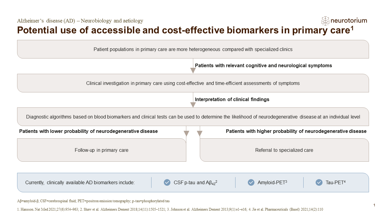 Today, CSF and PET measurements of Aß and tau pathology are valuable tools to aid the understanding of AD, and can be used to improve the accuracy of clinical AD diagnosis.1 However, the availability of PET and CSF AD biomarkers is limited and can be very costly (PET) or invasive (CSF).1 As a result, their use in clinical practice is likely to be restricted to more specialized centres.1 The development of blood-based biomarkers offers potential benefit over those currently available.5 Before these biomarkers are implemented in the clinic, several steps such as development of automated assays and establishment of universal cut-offs for abnormality are required.5 Additionally, optimization of diagnostic algorithms that combine different blood-based biomarkers and other easily accessible and cost-effective tools will allow individualized prediction of AD dementia in patients with mild cognitive symptoms.1 For patients with lower probability of neurodegenerative disease, follow-up in primary care may monitor the progression or improvement of symptoms, and consider alternative treatable conditions that may be contributing to symptoms.1 For patients with higher probability of neurodegenerative disease, more advanced clinical assessments may be carried out to determine the most probable neurodegenerative disease diagnosis.1 This would then allow the initiation of appropriate treatment and care.1