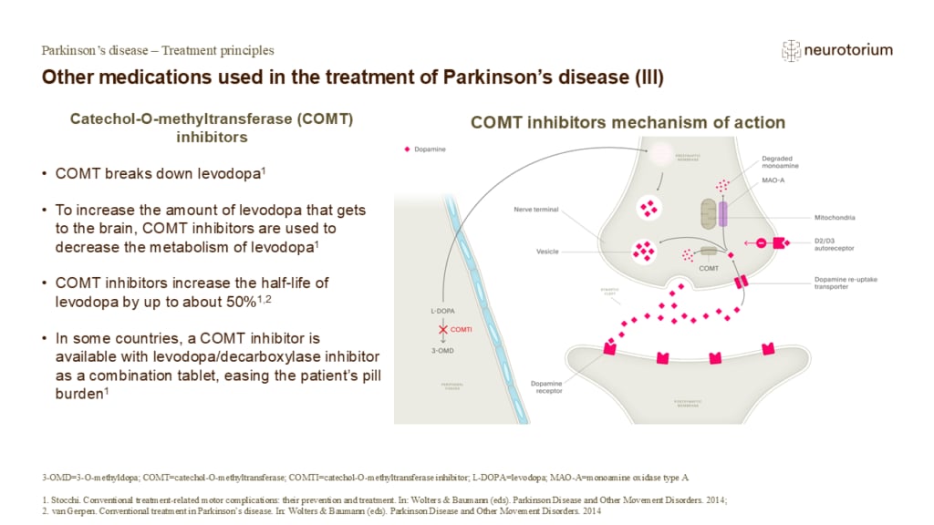 Patients who are experiencing ‘wearing-off’ may benefit from taking a catechol-O-methyltransferase inhibitor (COMT inhibitor).3,4 COMT inhibitors inhibit the breakdown of dopamine and of levodopa in the body, thus prolonging their therapeutic effect and time spent in ‘ON’…