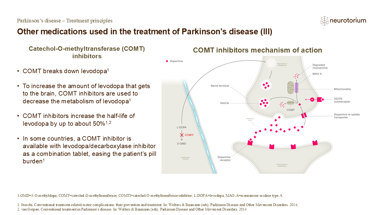 Patients who are experiencing ‘wearing-off’ may benefit from taking a catechol-O-methyltransferase inhibitor (COMT inhibitor).3,4 COMT inhibitors inhibit the breakdown of dopamine and of levodopa in the body, thus prolonging their therapeutic effect and time spent in ‘ON’ states.5