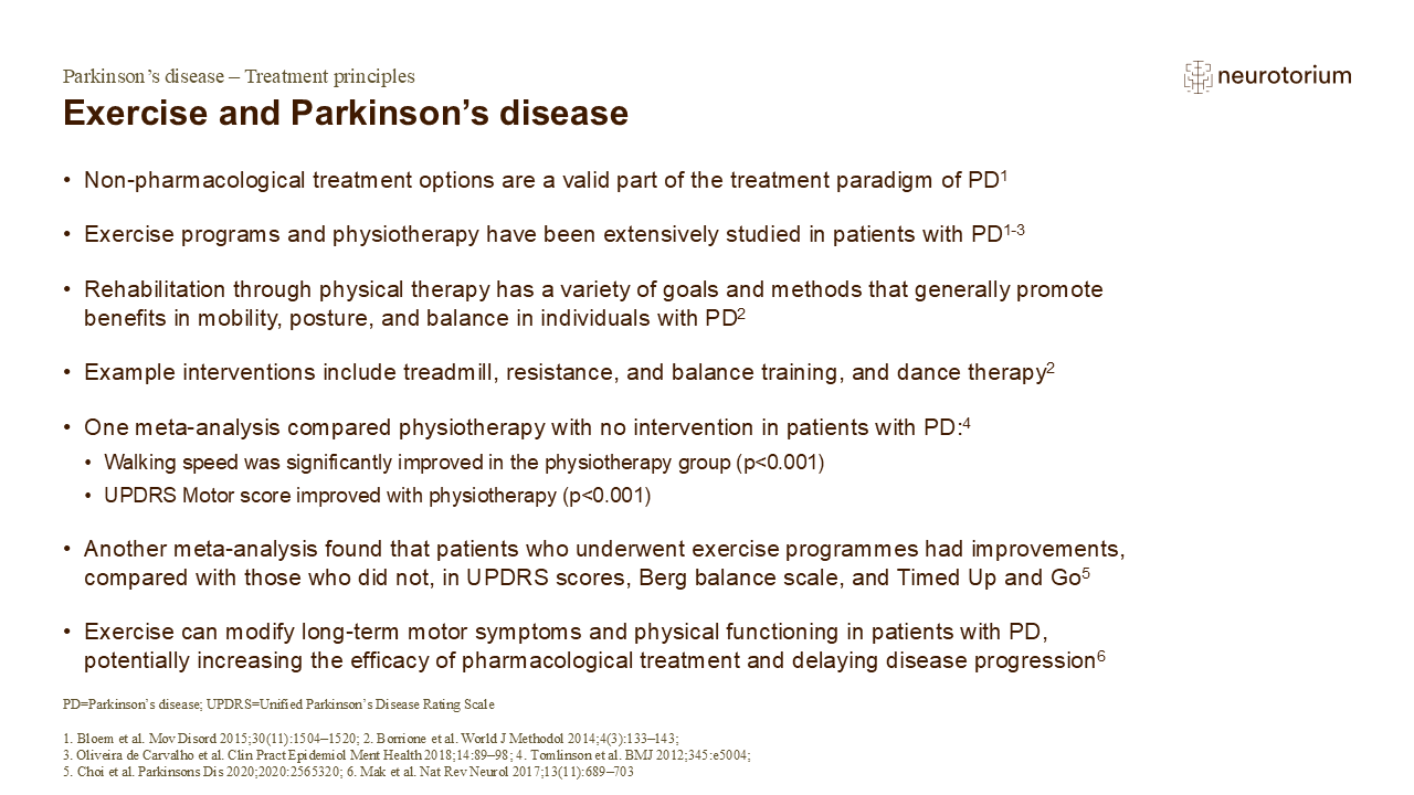 4. Tomlinson CL, Patel S, Meek C, et al. Physiotherapy intervention in Parkinson’s disease: systematic review and meta-analysis. BMJ 2012; 345: e5004.