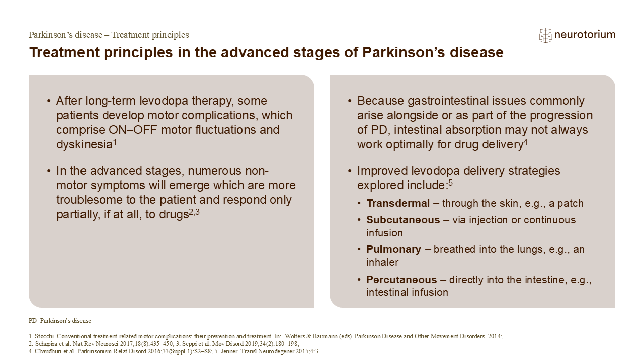 Although levodopa and dopamine agonists are initially able to control motor symptoms effectively, eventually most patients will start to develop motor complications, which comprise ON– OFF motor fluctuations and dyskinesia.1