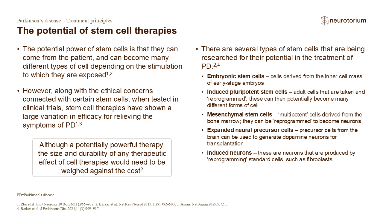 However, serious ethical and methodological issues remain, such as whether or not to use embryonic stem cells; how to prevent Lewy pathology from developing in transplanted cells; how best to deliver the cell-based therapies; and how to prevent a reaction against the transplanted cells by the patient’s immune system.1,2,4,5 Recently, it has become possible to work with ‘induced pluripotent stem cells’ (iPSCs), which can subsequently become neurons.5 Whilst more research is needed to test this method for treating Parkinson’s disease, an initial case-study has shown promising results for the iPSC approach.6