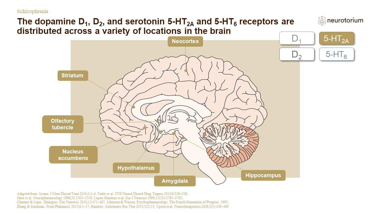 As shown on the slide, dopamine and serotonin receptors are distributed across a variety of locations in the brain.
