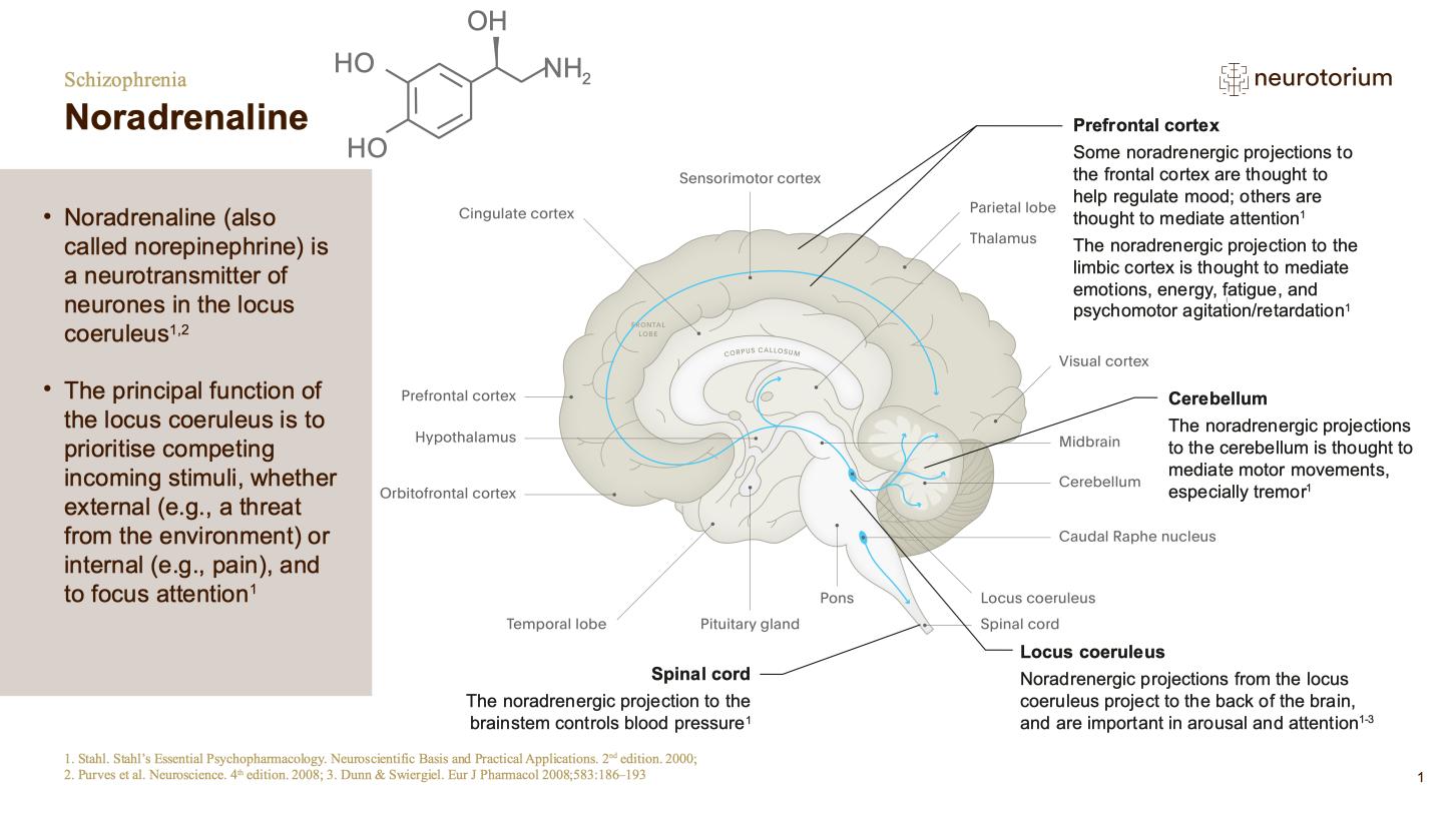 Noradrenaline acts on two classes of adrenergic receptor, α and β.[Purves et al., 2008] Noradrenergic neurones project widely throughout the brain, and there are many brain areas where serotonin, noradrenaline and dopamine projections overlap, allowing interactions.[Stahl, 2013]