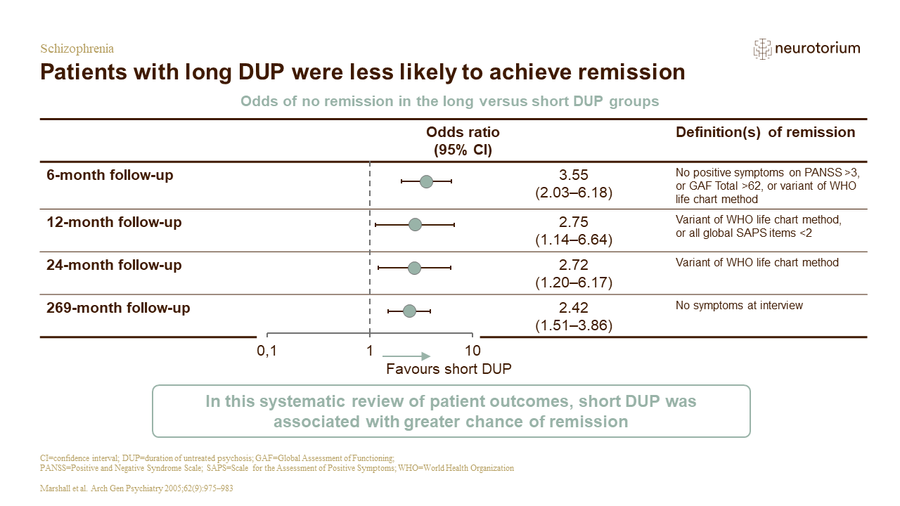 Marshall M, Lewis S, Lockwood A, et al. Association between duration of untreated psychosis and outcome in cohorts of first-episode patients: a systematic review. Arch Gen Psychiatry 2005; 62 (9): 975–983.